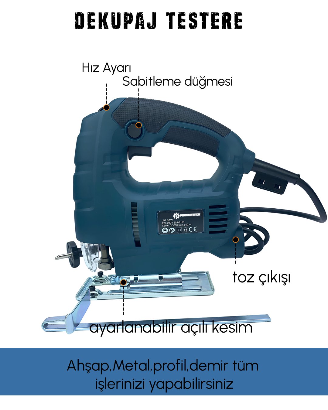 Ayarlı dekupaj ile düz kesim sağlamakta olup daha düzgün bir kesim sunmaktadır. Dekupaj testere sayesinde sunta,metal,ağaç ve mdf gibi bir çok malzemenin düzgün ve kolay şekilde kesilebilmesini sağlamaktadır.