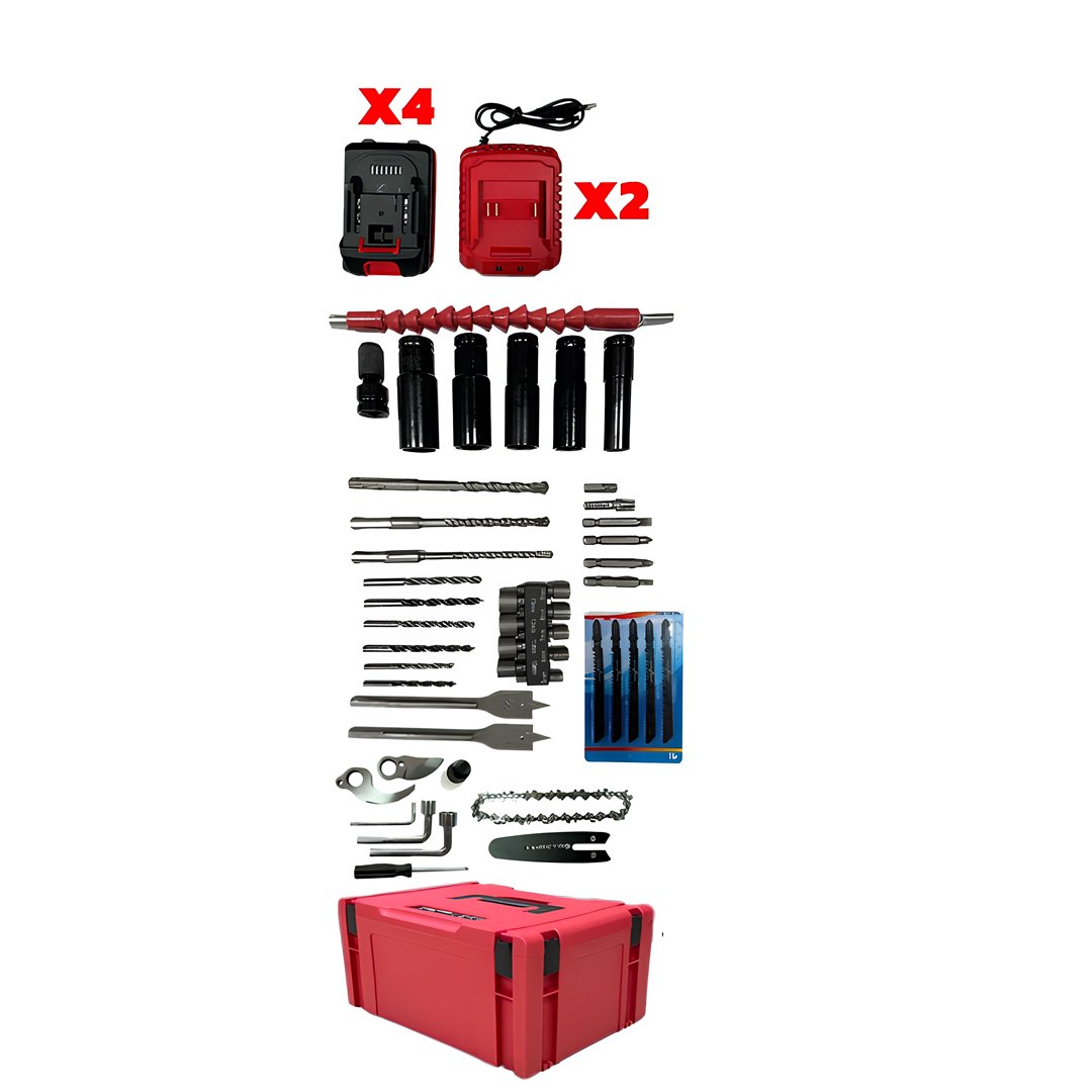Ürün içeriği: 1 adet çantası, 1 adet somun sıkma , 1 adet vidalama , 1 adet kırıcı , 1 adet taşlama, 1 adet dal budama makası, 1 adet dekupaj, 1 adet dal testeresi, 1 adet led ışık, 1 adet sunta kesme, 2 adet şarj cihazı, 4 adet batarya ve ekstra parçalar
